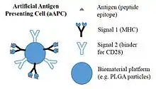 A variety of polymers have been added into aAPC systems, including biodegradable PLGA (Poly(lactic-co-glycolic acid)) and non-biodegradable sepharose or polystyrene beads. While IL-2 or other soluble molecules can be progressively released from within the aAPC, immunomodulatory substances (recognition and co-stimulatory ligands) can be attached to the surface of polymeric particles.[10]