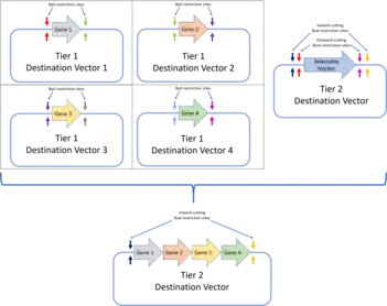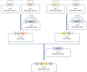 - Tier 1: Tier 1 assembly is the standard Golden Gate assembly, and genes are assembled from their components parts (DNA parts coding for genetic elements like UTRs, promoters, ribosome binding sites or terminator sequences). Flanking the insertion site of the tier 1 destination vectors are a pair of inward cutting BpiI restriction sites. This allows these plasmids to be used as entry vectors for tier two destination vectors.The MoClo assembly standard allows for Golden Gate constructs to be further assembled in subsequent tiers. In the example here, four genes assembled via tier 1 Golden Gate assembly are assembled into a multi-gene construct in a tier 2 assembly.The Golden Braid assembly standard also builds on the first tier of Golden Gate assembly and assembles further tiers via a pairwise protocol. Four tier one destination vectors (assembled via Golden Gate assembly) are assembled into two tier 2 destination vectors, which are then used as tier 3 entry vectors for the tier 3 destination vector. Alternating restriction enzymes (BpiI for tier 2 and BsaI for tier 3) are used.The MoClo and Golden Braid assembly standards are derivatives of the original Golden Gate assembly standard.
