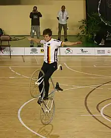 Artistic cycling is a form of competitive indoor cycling in which athletes perform tricks (called exercises) for points on specialized, fixed-gear bikes in a format similar to ballet or gymnastics. The exercises are performed in front of judges in five-minute rounds[1] by singles, pairs, four- or six-person teams.