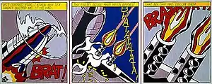 Measuring 170 cm × 430 cm (68 in × 168 in), As I Opened Fire is a triptych with verbal and temporal continuity.[2] In 1972, it was regarded as "...perhaps Lichtenstein's most ambitious exercise in strangely uniting, visually (as well as figuratively) warring elements."[3] Depicting a short few seconds during an aircraft battle, the painting is based on three panels of the original narrative which Lichtenstein has altered to improve its formal coherence.[4] This piece represents his affinity toward the high school "...highly emotional content, yet detached impersonal handling..."[5] As I Opened Fire exhibits Lichtenstein's "formal imagination". We see successive tighter views of the gun muzzles in action accompanied by an onomatopoeia, which provides cinematic flow despite the varying skies.[6] As I Opened Fire is regarded as a "very uncompromising military triptych".[7]