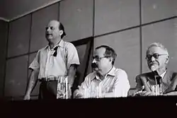 Shin Shalom, Asher Barash, and Nahum Slouschz at a Hebrew writers' conference in 1948