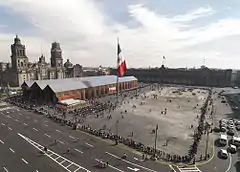 Originally made of shipping containers, the architectural design evolves as it travels. The most recent Nomadic Museum, in the Zócalo, Mexico City was the largest bamboo structure ever created.[4][5] Designed by Colombian architect Simón Vélez in collaboration with Colbert, the structure occupied 5,130-square meters (55,218 square feet) containing two galleries and three distinct theaters. For the first time, the Nomadic Museum incorporated water as a design element to recall the unique history of Mexico City, which was once surrounded by canals. This architectural choice honored the symbolic significance of the Zócalo as the center of Mexico-Tenochtitlan, a city founded by the Aztecs on a small island in the middle of Lake Texcoco in 1325.