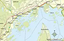 Sandvika Station is 14.14 km (8.79 mi) from Oslo S, at 12.0 metres (39.4 ft) elevation.[13] The track layout has been criticised by among others Norsk Bane, for not permitting high through speeds. A sharp curve before the station will not permit trains to travel at more than 80 km/h (50 mph), even if they are not scheduled to stop at the station. This will increase travel time, and hinder the efficiency of the line should it be used later for high-speed lines to Vestfold or Western Norway.[14] The proposed Ringerike Line would demerge just west of Sandvika Station.[5]