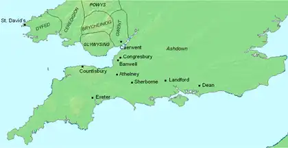 It is possible that Asser was a suffragan bishop within the see of Sherborne, but he may instead have been a bishop of St David's. He is listed as such in Giraldus Cambrensis's Itinerarium Cambriae, although this may be unreliable as it was written three centuries later, in 1191. A contemporary clue is found in Asser's own writing: he mentions that bishops of St David's were sometimes expelled by King Hyfaidd and adds that "he even expelled me on occasion." This also implies that Asser was himself a bishop of St David's.[2]
