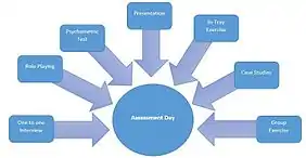 An assessment day is usually used in the context of recruitment. On this day, a group of applicants who have applied for a particular role are invited to an assessment centre, where a combination of selection techniques are used by the employers to measure the suitability of an individual for the job role. These selection technique usually include exercises such as presentation, group exercise, one to one Interview, role play, psychometric test etc.[1] Most large organisations like banks, audit and IT firms use assessment days to recruit the fresh talent in their graduate programmes. With an increase of popularity of assessment days, several training institutes have been formed that prepare candidates for assessment days, for example, Green Turn is a famous institute that prepares candidates for assessment days of big 4 accountancy firms.[2]