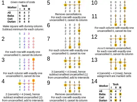 - The problem instance has a number of agents and a number of tasks. Any agent can be assigned to perform any task, incurring some cost that may vary depending on the agent-task assignment. It is required to perform as many tasks as possible by assigning at most one agent to each task and at most one task to each agent, in such a way that the total cost of the assignment is minimized.