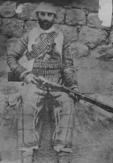 In April 1915 the Assyrian nation, led by its main tribal chiefs of Bit-Bazi, Bit-Jilu, Bit-Tyari, Bit-Tkhuma, Bit-Shamasha, Bit-Eshtazin, Bit-Nochiya and Bit-Diz "took arms against the Turks at the request of the Russians and British."[28] Over the summer of 1915 they successfully held off the far larger Ottoman army and 10,000 Kurdish militia and tribal forces fighting with the Ottomans. The Ottomans, unable to break the Assyrians, then brought in heavy artillery and ammunition that, together with an overwhelming advantage in numbers and supplies, eventually overwhelmed the lightly armed and outnumbered Assyrians. The Russian Army Corps had promised reinforcements, which came too late, leading most of the population of the tribes and districts of Baz, Jilu, Tyari, Tkhuma, Tergawar, Mergawar, Bohtan, Barwari, Amadia and Seert to be massacred, including women, children and the elderly. Churches and monasteries were destroyed or converted into Mosques, livestock and possessions were stolen by the Turks and Kurds, who then occupied the emptied Assyrian towns, villages and farmsteads.[28] Survivors of fighting age joined the Assyrians of northwest Persia, northern Iraq and northeast Syria, including those from Salamas and Urmia to form an Assyrian army, and had a real prospect of fighting with the Russians to evict the Ottoman forces from Persia, and historic Assyria. The Assyrians, under such leaders as Agha Petros and Malik Khoshaba, scored a number of victories over the Ottoman and Kurdish forces despite overwhelming odds during this period, until the Russian Revolution of 1917 dissolved the Russian army.