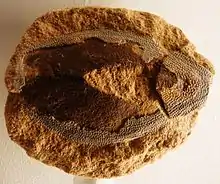 Asterolepis is an extinct genus of antiarch placoderms from the Devonian of North and South America and Europe.[1] They were heavily armored flat-headed benthic detritivores with distinctive jointed limb-like pectoral fins[2] and hollow spine.[3] The armor plate gives the Asterolepis a box-like shape. Its pectoral fins are also armored but the caudal and dorsal fin are not. The first fossils were named by M. Eichwald in 1840 after noticing star-like markings on the fossils.