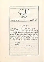 The journal At-Tabib (“The doctor“) was edited between 1884 and 1885 by the Lebanese linguist and journalist Ibrāhīm al-Yāziǧī (1847-1906) as well as by Bišāra Zalzal (1851-1905) and Ḫalīl Saʿāda. In total, they published 24 numbers in one year in Beirut, coming out every two weeks.[1] The predecessor of At-Tabib, Ahbār Tibbiya (“medical notifications”), had already been founded in 1874 by George E. Post (1838-1909). Being a member of the American Mission in Beirut as well as a professor at the Medical School of the Syrian Protestant College (nowadays the American University of Beirut, AUB), post created a medical journal for the College's students. After taking over the post of editor in chief, al-Yāziǧī changed it into an encyclopedic educational publication that now bore the subtitle Maǧalla ṭibbīya ʿilmīya ṣināʿīya and was guided by the examples of Al-Jinan and Al-Muqtataf. The content of its articles was medical, scientific, literary and linguistic.[2] Even though he failed with At-Tabib, it was only some years later that al-Yāziǧī published two other periodicals in Cairo: Al Bayan and Ad-Diya.