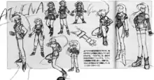 Athena Asamiya is based on the title character from SNK's video game Athena. The staff did not like the title character and thus wanted to create an improved sequel, Psycho Soldier. Athena has long pink hair and wears a black Japanese school uniform. In order to generate contrast between the two Athenas, Psycho Soldier's was designed to look more mature.[1][2] In retrospective, character designer Ogura felt Athena's marketing as an idol was ahead of its time, citing things such as her songs and anime-like illustrations. The fact that Athena changed outfits in every game felt like something that Ogura believed would appeal to the demographic.[3]
