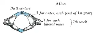 Of these, one appears in each lateral mass about the seventh week of fetal life, and extends backward; at birth, these portions of bone are separated from one another behind by a narrow interval filled with cartilage.