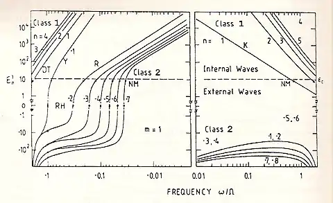 n (Figure 2). There exist two kinds of waves: class 1 waves, (sometimes called gravity waves), labelled by positive n, and class 2 waves (sometimes called rotational waves), labelled by negative n. Class 2 waves owe their existence to the Coriolis force and can only exist for periods greater than 12 hours (or |ν| ≤ 2). Tidal waves can be either internal (travelling waves) with positive eigenvalues (or equivalent depth) which have finite vertical wavelengths and can transport wave energy upward, or external (evanescent waves) with negative eigenvalues and infinitely large vertical wavelengths meaning that their phases remain constant with altitude. These external wave modes cannot transport wave energy, and their amplitudes decrease exponentially with height outside their source regions. Even numbers of n correspond to waves symmetric with respect to the equator, and odd numbers corresponding to antisymmetric waves. The transition from internal to external waves appears at ε ≃ εc, or at the vertical wavenumber kz = 0, and λz ⇒ ∞, respectively.