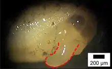 Atopos sp. slug proboscis (marked with red outline) (the proboscis was not fully extended).