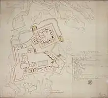 During the hearing, Danckwardt mentioned that a few volunteers from the ship crews and the garrison had left the fortress to "overwhelm the enemy" but could not get any further than the castle hill, since enemy soldiers were deployed around Marstrand cemetery, which was close by. The force of volunteers promptly turned back and re-entered the fortress, according to Danckwardt.[23] In the afternoon, firing on Carlsten continued from the mortar batteries on Koön. A shed which was being used as temporary gunpowder storage was hit and exploded. A fire also broke out on the tower roof and on parts of Fyrkantsbatteriet, an outwork on the eastern side of the fortress, which were put out by fortress personnel. No deaths were reported as a result of the artillery fire but Swedish morale was depressed because of the Danish conquering of their outworks and the sinking of the Swedish fleet. On the night to Monday, Tordenskjold landed 200 soldiers on Marstrand island, 500 men in total.[24]