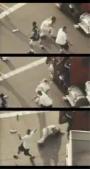 Antoine Miller climbed up and opened the truck door, giving an unidentified man the chance to pull Denny out and throw him on the ground. Henry Watson stood on Denny's neck to hold him down as a group of men surrounded him and Anthony Brown kicked him in the abdomen.[9][3] As Watson walked away, two other unidentified men joined in the attack: one hurled a five-pound oxygenator stolen from Larry Tarvin's truck at Denny's head,[10] and the other kicked him and hit him with a claw hammer.[9] News footage showed Damian Williams throwing a cinder block at Denny's head, then doing a football-style victory dance in the road and gesticulating gang signs at the Los Angeles News Service helicopter of Zoey Tur[lower-alpha 1] and Marika Gerrard.[3][11] After the beating ended, some men threw beer bottles at the unconscious body and a man searched Denny's back pockets, taking his wallet.[9][3] Tur and Gerrard reported that there was no police presence in the area.[5]