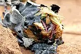 Dusty-green caterpillars hatch after approximately two weeks and feed voraciously on the foliage of citrus, cinnamon, guava, and evergreen trees.[14] The caterpillars can grow to 11.5 cm (4.5 in) in length and 2.5 cm (0.98 in) in thickness. They are adorned with white, waxy, fleshy spines along their backs, which become more prominent at later instars. Beside the prolegs on the last abdominal segment, there is a large green spot surrounded by an orange ring. The majority of the time their first meal is their egg-shell.[15]