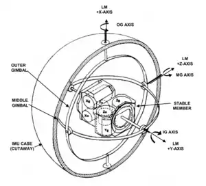Attitude indicators are also used on crewed spacecraft and are called Flight Director Attitude Indicators (FDAI), where they indicate the craft's yaw angle (nose left or right), pitch (nose up or down), roll, and orbit relative to a fixed-space inertial reference frame from an Inertial Measurement Unit (IMU).[13] The FDAI can be configured to use known positions relative to Earth or the stars, so that the engineers, scientists and astronauts can communicate the relative position, attitude, and orbit of the craft.[14][15]