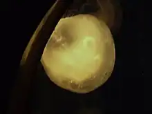 Brown moon jellies have eight rhopalia (sensory structures) and numerous thin and long tentacles.[4] Their bell, or body, is 25–30 centimetres (9.8–11.8 in) in diameter.[3][5] A. limbata has a cup-like calyx.[6] Most of the female A. limbata observed had golden yellow planulae that were located in brood pouches on their oral arms.[3]