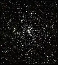 M36 (NGC 1960) is a young galactic open cluster with approximately 60 stars, most of which are relatively bright; however, only about 40 stars are visible in most amateur instruments.[89] It is at a distance of 3,900 light-years and has an overall magnitude of 6.0; it is 14 light-years wide.[9][17][41] Its apparent diameter is 12.0 arcminutes.[89] Of the three open clusters in Auriga, M36 is both the smallest and the most concentrated, though its brightest stars are approximately 9th magnitude.[10] It was discovered in 1749 by Guillaume Le Gentil, the first of Auriga's major open clusters to be discovered. M36 features a 10-arcminute-wide knot of bright stars in its center, anchored by Struve 737, a double star with components separated by 10.7 arcseconds. Most of the stars in M36 are B type stars with rapid rates of rotation.[41] M36's Trumpler class is given as both I 3 r and II 3 m. Besides the central knot, most of the cluster's other stars appear in smaller knots and groups.[89]