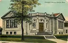 Mills, powered by the Cedar River, were the first industries in Austin. They provided much-needed flour and lumber. Growth was slow during the first two decades, but the Chicago, Milwaukee, and St. Paul railroad arrived in the late 1860s, hastening economic development.[5] The town's first schoolhouse was constructed in 1865 and the first bank opened the following year.