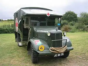 A total of 13,102 Austin K2/Y ambulances (the front mudguards ended at the 'doors') were built at the company's Longbridge plant almost continuously from 1940 until the war ended. An estimated 50 or more[1] remain today. The Austin chassis was one of three main designs fitted with Mann Egerton bodies, the others being Morris Commercial CS11/30F (the front mudguards ended underneath the rungs) and Bedford ML 54 (the front mudguards ended before the 'doors'). It is estimated there are two remaining Morris Commercials, but no Bedford examples are said to survive.