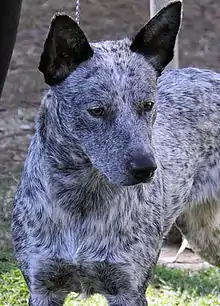 There are a number of theories on the origin of the Australian Stumpy Tail Cattle Dog. One is that it descended from Halls Heelers, a dog produced from crossing the Northumberland Blue Merle Drovers dogs with other herding breed.[4] Some early dog breeders believed Dalmatian and Australian Kelpies were included.[5] Some believe that Bull Terrier heritage may have occurred.[6] Others believe that this dog developed from crossing first the Black Bobtail Smithfield herding dog of England, which were brought to Australia in the early 19th century, with the dingo to produce the Red Bobtail, and then crossing with the Smooth-haired Blue Merle Collie. Records of working dogs are scarce from this time period, and there are differing accounts of the breed's development. One is that a drover named Timmins from Bathurst, New South Wales, crossed the Smithfield dogs with dingoes, producing a type of working dog called Timmins' Biters.[1][7] In order to mute their dingo characteristics and make the dogs easier to handle, further crosses were made with Smooth Collies, producing speckled red and blue dogs that were often born tailless.[1]