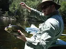 Fishing for Australian bass is a summer pastime, undertaken during the warmer months in the freshwater reaches of the rivers they inhabit. Australian bass are keenly fished for as they are an outstanding sport fish, extraordinarily fast and powerful for their size. Their extraordinary speed and power is probably due to their significant, strenuous annual migrations for spawning and a life-style that is migratory in general. Australian bass in their natural river habitats are not to be underestimated; they head straight for the nearest snags (sunken timber) when hooked, and light but powerful tackles with stiff drag settings are needed to stop them.[4][5]