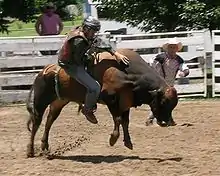 The term buck-jumping, as a regular activity involving horses, was in use in Australia by 1855.[1] Newspaper reports recorded public roughriding events that took place in Victoria during the 1880s. These events included competitions for roughriding and bullock-throwing which was accomplished by riding up to bullock, grabbing its tail and throwing it off balance and then tying its legs. This competition arose from the stockman's skill in capturing feral or wild cattle.[2]