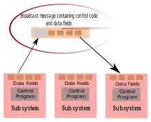 An ADS is a decoupled architecture where each component or subsystem communicates by message passing using shared data fields. A unique feature of the ADS is that there is no central operating system or coordinator. Instead each subsystem manages its own functionality and its coordination with other subsystems. When a subsystem needs to interact with other subsystems it broadcasts the shared data fields containing the request to all other subsystems. This broadcast does not include the identification or address of any other subsystem. Rather the other subsystems will, depending on their purpose and function, receive the broadcast message and make their own determination on what action (if any) to take.