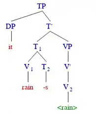 In all of the above examples, the pronoun corresponding to English it (in French, il; in German es) does not point to a specific entity in the real world: it is neither a person, nor a "thing capable of participating in any way in the process of raining."[3] (Although, as an interesting aside, Tesnière mentions that some believe avalent verbs began as monovalent verbs, where the subject referred to some divine being who was causing the weather.[3] For example, in the Greek sentence, Ὅμηρος ὑπέλαβεν . . . ὗσαι τὸν Δία, meaning "Homer believed that Zeus was raining".[7]) Tesnière states that the third person marker does not tell the listener/reader anything about the subject, because there is no concept of an actant (or agent) attached to it. Figure 1 shows a phrase structure tree of the English sentence It rains. While it does not appear to contribute any meaning to the sentence, it is still syntactically required to be present. For example, an English speaker cannot simply say, Rains, because attempting to pronounce the sentence without the pleonastic it renders the sentence ungrammatical. This ungrammatical instance arises from a violation of the Extended Projection Principle (EPP) which states that all tensed phrases must have a subject.[8] In Figure 1, it occupies the subject (or, specifier) position of the tense phrase (TP), satisfying the EPP, and making the sentence It rains grammatical.