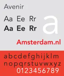 - The city of Amsterdam uses Avenir as the principal typeface in its visual identity. The font was chosen when design bureau Eden Design & Communication won a citywide competition. Eden contracted Thonik for the new design.[11]