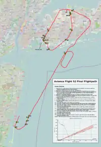 The flight departed Medellín at 15:08, bound for JFK.[2]: 1–2 The flight first entered U.S. airspace of Miami Air Route Traffic Control Center at 17:28, flying at 35,000 feet (10,700 m), and proceeded northward, climbing to 37,000 feet (11,300 m).[lower-alpha 6] The flight was cleared to fly Atlantic route 7 to the DIXON navigational aid[lower-alpha 7] and jet airway 174 to Norfolk, Virginia. Flight 052 entered its first holding pattern over Norfolk at 19:04 and remained circling until 19:23. From there, Flight 052 continued on to the BOTON intersection near Atlantic City, New Jersey, where it was placed in a second holding pattern from 19:43 to 20:12.[lower-alpha 8] The flight proceeded to the CAMRN intersection where it entered its third holding pattern from 20:18 to 20:47.[lower-alpha 9][2]: 1–2 Flight 052 entered the CAMRN holding pattern at 14,000 feet (4,300 m), having been cleared to descend prior to arrival at the intersection, and the flight descended further to 11,000 feet (3,400 m) while in the CAMRN holding pattern. At 20:44:09, while still holding at CAMRN, the New York Air Route Traffic Control Center (ZNY) advised Flight 052 that there was an "indefinite hold" and to continue holding at CAMRN.[2]: 177 At 20:44:43, the ZNY controller told the flight to "expect further clearance" at 21:05.[2]: 177 [lower-alpha 10] The flight had previously been given two delay estimates that had passed.[2]: 1–2