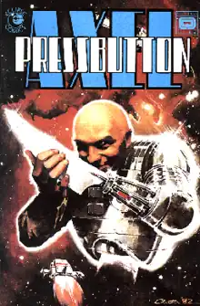 Before Warrior had ended the character had already made his debut in American comics. Skinn had initially struck a deal with Pacific Comics to print Warrior material, but the company went bankrupt before any was published; the deal was taken over by Eclipse Comics.[5] They repackaged the Warrior strips, along with other material from the magazine such as Zirk, Warpsmith and Ektryn, as a bi-monthly 6-issue colour mini-series called Axel Pressbutton, from November 1984 to July 1985.[6] Eclipse's promotion for the series linked it firmly to the British Invasion, and claimed the first issue had "sold out".[7] The title received positive reviews.[5]