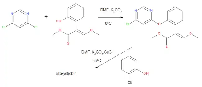 The first synthesis of azoxystrobin was disclosed in patents filed by the ICI group.[15] The sequence of the two substitution reactions allows for the synthesis of a diverse range of structural analogs via an Ullmann-type etherification between the aryl chloride of the first intermediate and a substituted phenol, thus introducing a range of structural diversity while maintaining the central strobin toxophore. The final choice of 2-cyano phenol in the second step of the synthesis was made after many other alternatives had been tested for their fungicidal properties.[11]:704
