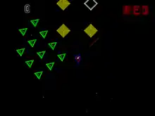 Aztarac is a scrolling multidirectional shooter with color vector graphics. It was developed by Tim Stryker (1954-1996) and released in arcades by Centuri in 1983. The player commands an intergalactic race of mutant humans whose mode of transport is a tank. Its turret is independently controlled, allowing the player to move in one direction while shooting in another. The mission is to guard space outposts from hordes of incoming enemy ships. Aztarac's color vector graphics were impressive at the time of release, and a circular plastic lens over the screen accentuates the visuals. Few machines were produced, though the exact number is unclear. Centuri only developed two vector games; Aztarac was the second.[2]