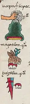 A glyph could be used as a rebus to represent a different word with the same sound or similar pronunciation. This is especially evident in the glyphs of town names.[6] For example, the glyph for Tenochtitlan, the Aztec capital, was represented by combining two pictograms: stone (te-tl) and cactus (nochtli).