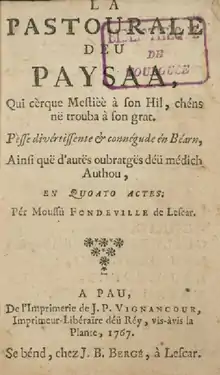 During the 17th century, the Béarnese writer Jean-Henri Fondeville (among others) composed plays such as La Pastorala deu Paisan and also his anti-Calvinist Eglògas. Cyprien Despourrins is certainly one of the main 18th-century Béarnese poets; many of his poems are still Béarn's folk songs.[4][5] From the 19th century we can mention poet Xavier Navarrot and also Alexis Peyret, who emigrated to Argentina for political reasons where he edited his Béarnese poetry.[6]