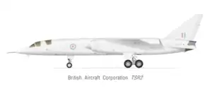 The British Aircraft Corporation TSR-2 is a cancelled Cold War strike and reconnaissance aircraft developed by the British Aircraft Corporation (BAC), for the Royal Air Force (RAF) in the late 1950s and early 1960s. The TSR-2 was designed around both conventional and nuclear weapons delivery: it was to penetrate well-defended frontline areas at low altitudes and very high speeds, and then attack high-value targets in rear areas. Another intended combat role was to provide high-altitude, high-speed stand-off, side-looking radar and photographic imagery and signals intelligence, aerial reconnaissance. Only one airframe flew and test flights and weight-rise during design indicated that the aircraft would be unable[1] to meet its original stringent[2] design specifications.[3][4][5][N 1] The design specifications were reduced as the result of flight testing.[6]