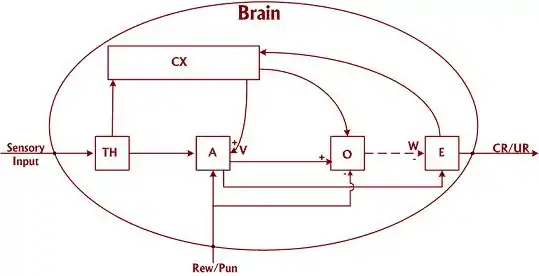 O, the orbitofrontal cortex, operates based on the difference between the perceived (i.e. expected) reward/punishment and the actual received reward/punishment. This perceived reward/punishment is the one that has been developed in the brain over time using learning mechanisms and it reaches the orbitofrontal cortex via the sensory cortex and the amygdala. The received reward/punishment on the other hand, comes courtesy of the outside world and is the actual reward/punishment that the specie has just obtained. If these two are identical, the output is the same as always through E. If not, the orbitofrontal cortex inhibits and restrains emotional response to make way for further learning. So the path W is only activated in such conditions.