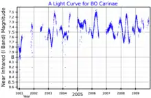 Billed as an irregular variable like TZ Cassiopeiae or V528 Carinae; its apparent brightness fluctuates between magnitude +7.18 and +8.50 without clear periodicity.[1][9] Some observers have found BO Car not to be variable,[10] but more extensive studies find small amplitude variations with a possible period of 145 days.[11]