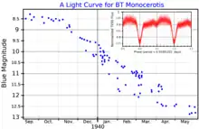 BT Monocerotis (Nova Monocerotis 1939) was a nova, which lit up in the constellation Monoceros in 1939. It was discovered on a spectral plate by Fred L. Whipple on December 23, 1939.[5] BT Monocerotis is believed to have reached mag 4.5, which would have made it visible to the naked eye, but that value is an extrapolation; the nova was not observed at peak brightness[2] Its brightness decreased after the outbreak by 3 magnitudes in 182 days, making it a "slow nova".[6] The light curve for the eruption had a long plateau period.[5]