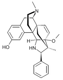 BU72 is an extremely potent opioid, with one of the highest known affinities for the μ-opioid receptor. In animal studies, it was found to be a potent analgesic, with a slow onset and long duration of action, but was not considered suitable to develop for medical use.[1] It was used to produce the first crystal structure of the active μ-opioid receptor,[2] and is now widely used to model the activation process.[3][4][5] The stereochemistry has recently been revised, with the phenyl group in the (R) configuration,[6] which has been accepted by the authors of the crystal structure.[7]