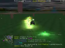 BZFlag has three types of flags: team flags, bad flags and super flags.[8] Team flags are only placed in a world during a capture-the-flag game, and represent the team it is colored to. Super flags are flags that can be in both free-for-all games and capture-the-flag games, but are strongly controlled by a server operator. The number, types of super flags, as well as where they are placed can all be controlled by the operator. Super flags come in both bad and good form, and affect a tank accordingly. A bad flag may take away a certain sense of the tank: its sight, speed, or related things, while a good flag does the opposite and actually helps a tank. Good super flags are usually held until the tank is killed and explodes, or until the player driving the tank chooses to drop the flag. Bad flags are dropped after a short amount of time, after a certain number of "wins", or until the tank dies. The rules for dropping bad flags are set by the operator. All super flags have a one or two letter code that is displayed next to a player's name on the scoreboard when that player has that flag. Once in a while, a new flag is introduced, which anyone can contribute to via developer contact or the wiki.[7]