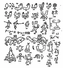 The first script consists of pictographic symbols decorating weapons found in Ba graves in eastern Sichuan.[3] About two hundred individual symbols have been identified. The most common depict human faces, hands and figures, tigers, turtles, dragons, flowers, birds and cicadas. There are also some abstract forms.[4][5] The longest inscription, on a lacquer tray found near Changsha, Hunan, consists of 11 symbols.[6]