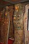 It contained 254 richly decorated coffins (101 double sets) giving 153 coffin sets in total, as well as 110 shabti boxes, 77 Osirian wooden statuettes (mostly hollow and containing a papyrus), 8 wooden steles, 2 large wooden statues (Isis and Nephthys), 16 canopic reed baskets, 5 round baskets made of woven reed.[6] The coffins were made almost exclusively with wood from the native fig tree, the Ficus sycomorus.[7]