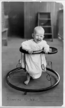 Go-cart was a common historical name for the wheeled version.[17] Other alternatives were also used. A baby-runner was a padded wooden ring, set at the height of the baby's waist, on a pole that was fixed into the floor and ceiling. The baby was placed inside the ring and able to move in a circle around the pole. This prevented the baby from reaching dangerous places, such as hot ovens.[17]