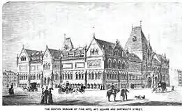 - The first monumental structure in Copley Square was the original Museum of Fine Arts, begun 1870 and opened 1876. After the museum moved to the Fenway neighborhood in 1909 its red Gothic Revival building was demolished to make way for the Fairmont Copley Plaza Hotel (1912–present).