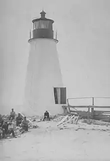 This lighthouse constructed in 1829 by Winslow Lewis of Boston, was a 30-foot (9.1 m) conical masonry tower similar to others further up the bay. A hint of its coming travails was given by the need for a 144-foot (44 m) long footbridge to carry the keeper over the marshy land between the tower and his house. Ten oil lamps and ten parabolic reflectors fourteen inches in diameter, coated with pure silver, were initially installed. When placed in service, the light's ‘characteristic’ was described as “continuous revolving white with a 90-second interval. As technology improved it later housed a Fresnel lens.