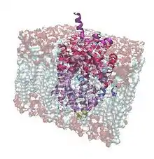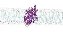 Bacterial Leucine Transporter (LeuT) is a bundled twelve alpha helix protein which belongs to the family of transporters that shuttle amino acids in and out of bacterial cells. Specialized in small hydrophobic amino acids such as leucine and alanine, this transporter is powered by the gradient of sodium ions that is normally maintained by healthy cells across their membranes. LeuT acts as a symporter, which means that it links the passage of a sodium ion across the cell membrane with the transport of the amino acid in the same direction. It was first crystallized to understand the inner molecular mechanisms of antidepressant's work since it has a close resemblance with the human neurotransmitter transporters (more difficult to crystallize) that these drugs block, thus inhibiting the reuptake of chemical messengers across the cell membrane of nerve axons and glial cells.[1][2]