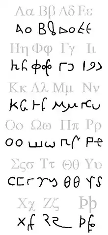 ![]() The Bactrian alphabet (block and cursive letters, here in black). The Bactrian script was directly adapted from the Greek script (here in grey), with the addition of the letter sho ( | |